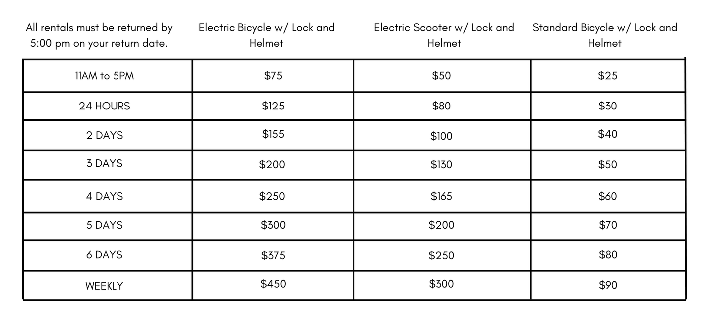 Please use the e-bike rental booking tool below via Fleetmaid, to choose your preferred bike and schedule. Let us know if you have questions!