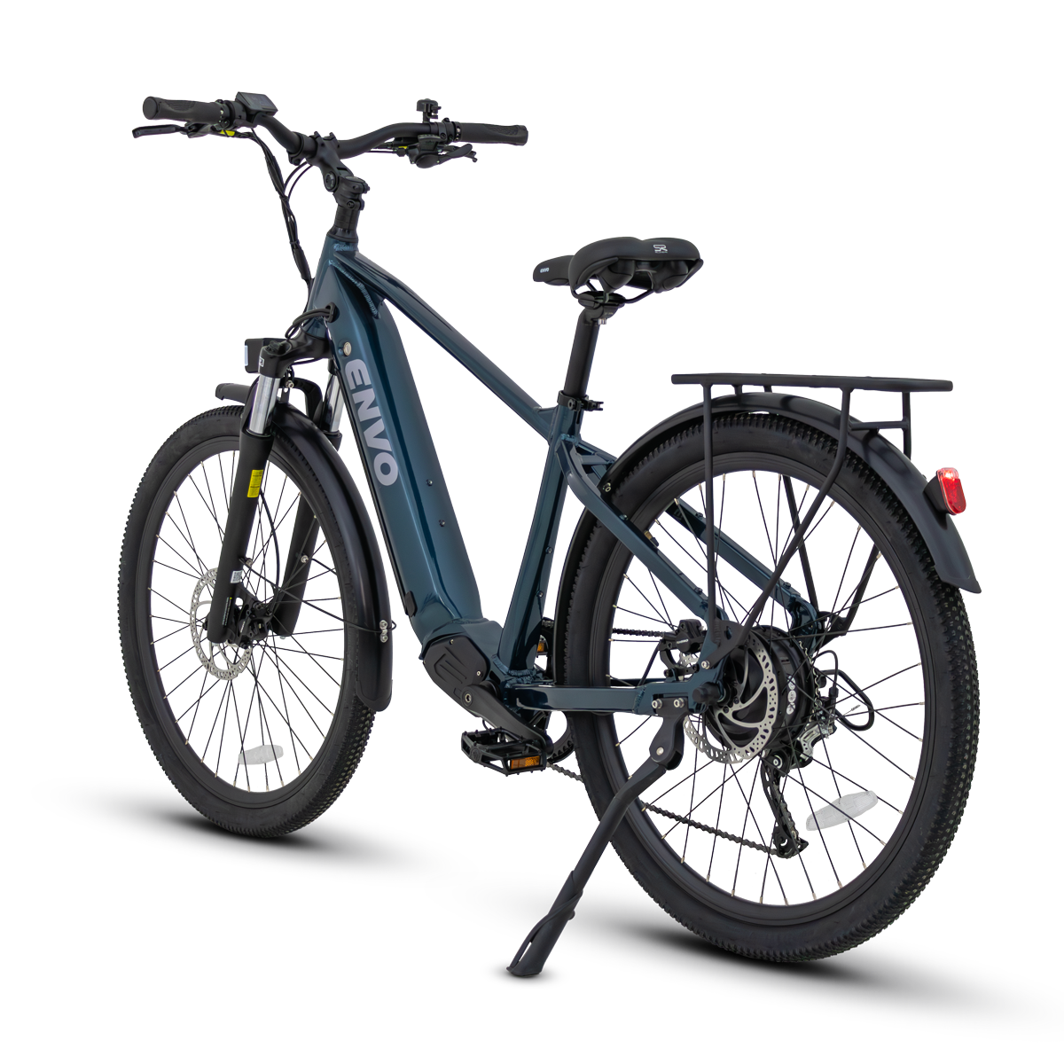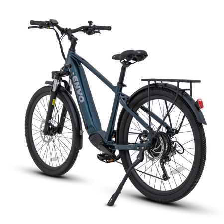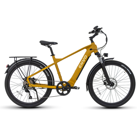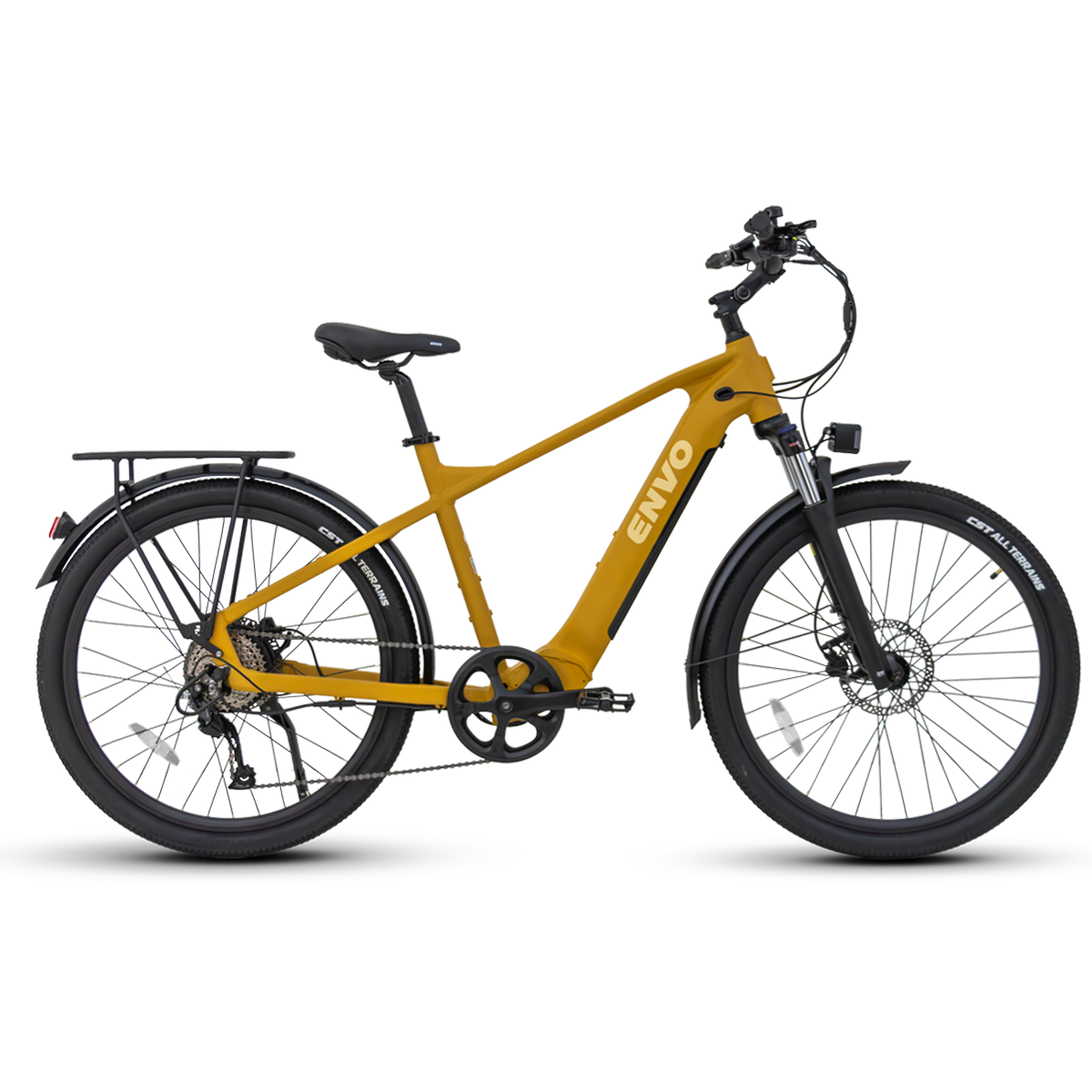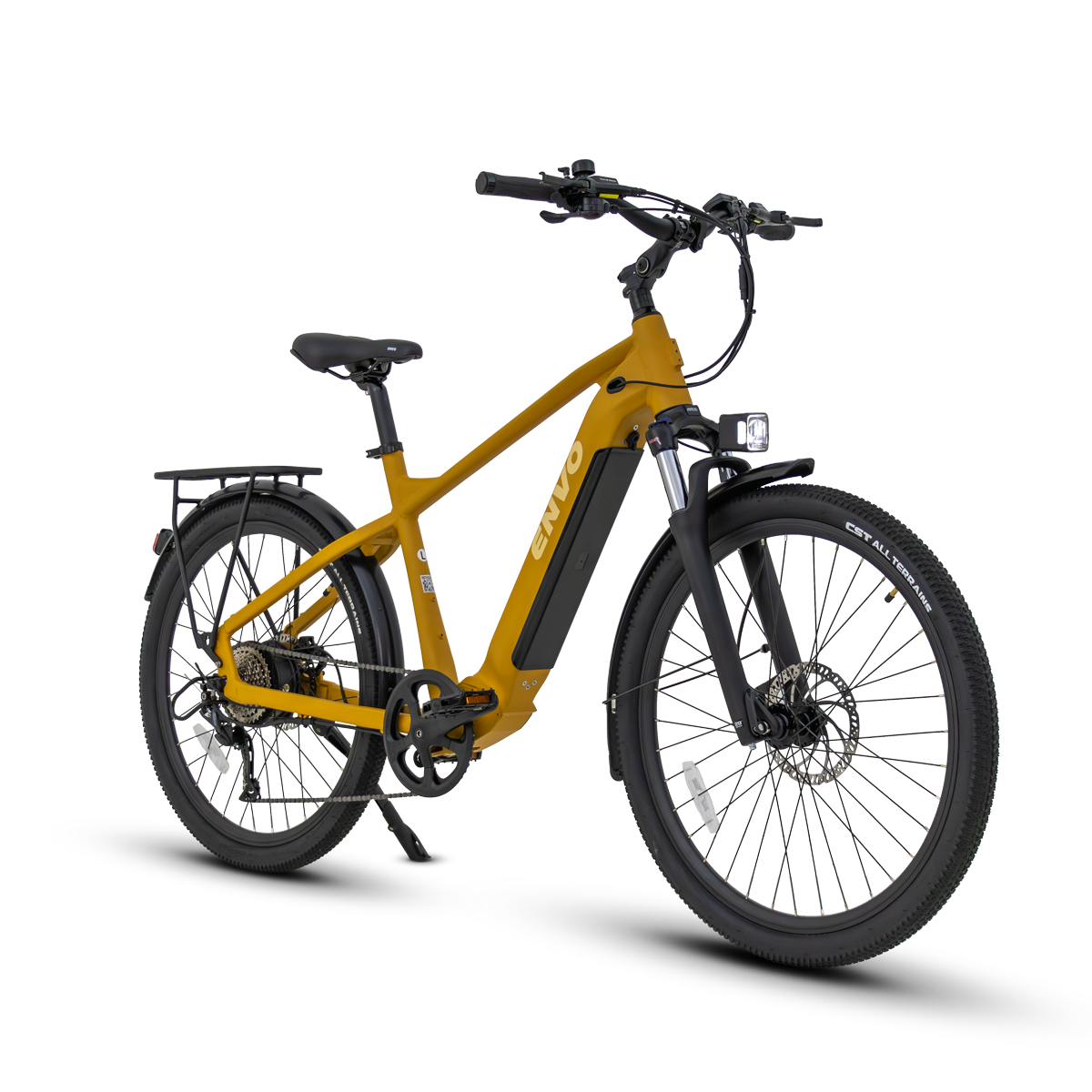 ENVO D50 is an e-bike that functions as a commuter and cargo carrier. Its rugged frame coupled with suspension fork allows for smooth rides on any terrain. Powered by a 750W motor, the bike's cargo rack and basket can easily transport tools, groceries, or even second passenger.