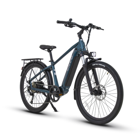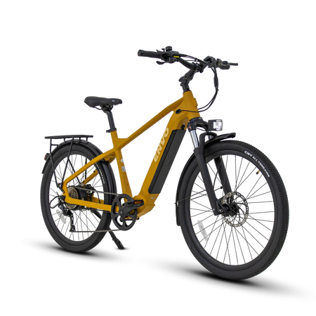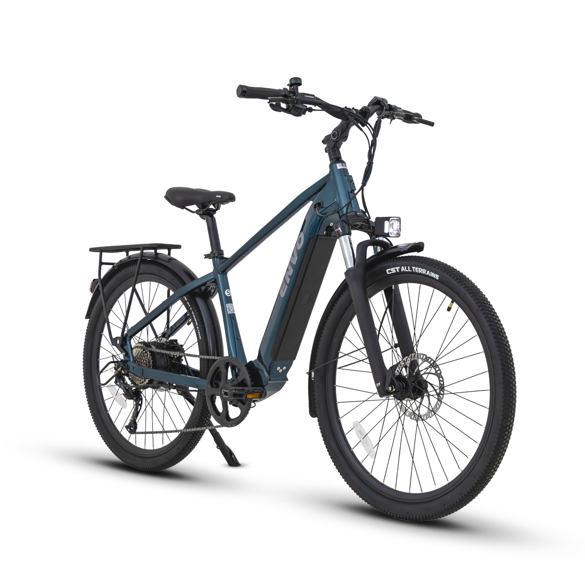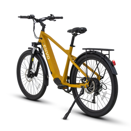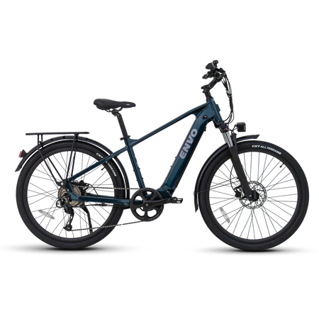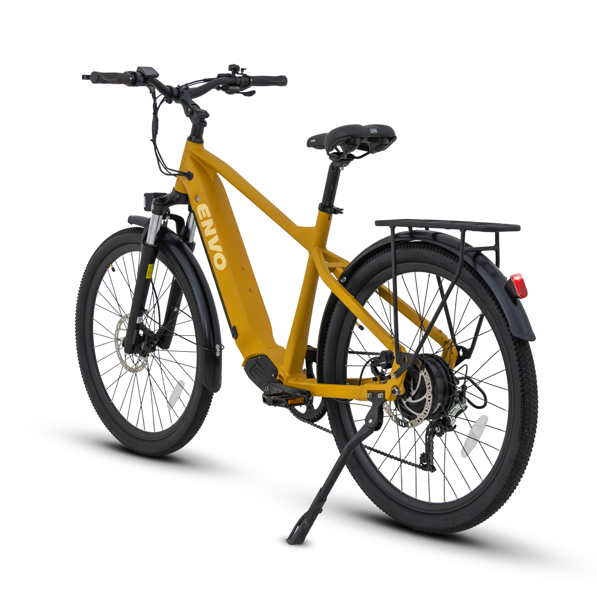 ENVO D50 is an e-bike that functions as a commuter and cargo carrier. Its rugged frame coupled with suspension fork allows for smooth rides on any terrain. Powered by a 750W motor, the bike's cargo rack and basket can easily transport tools, groceries, or even second passenger.