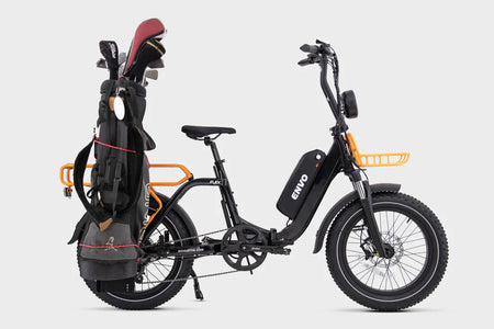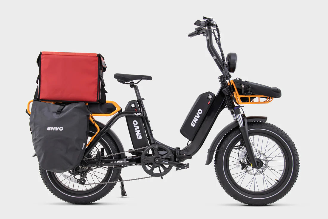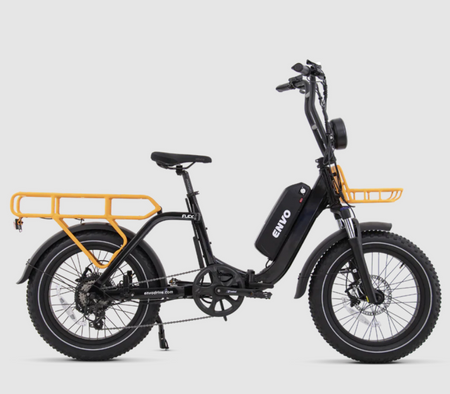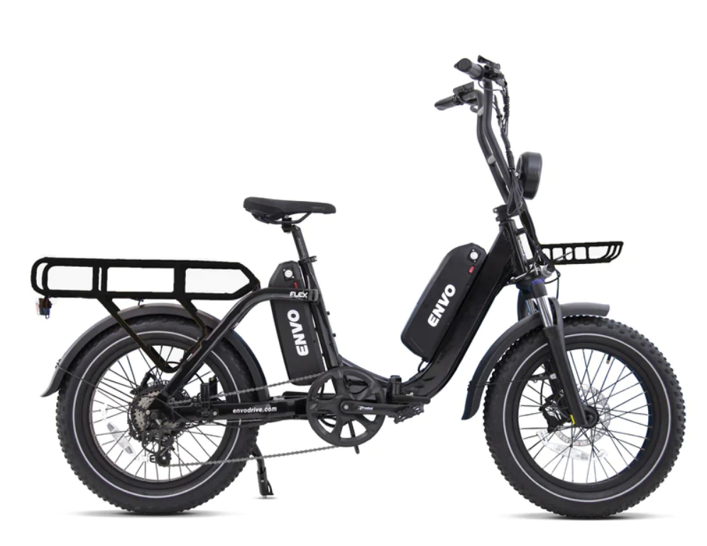 ENVO Flex comes with a specially designed cargo rear rack with rating of 150 lbs weight and capable of fitting two child seats. The rear rack allows a second adult to ride on the e-bike.