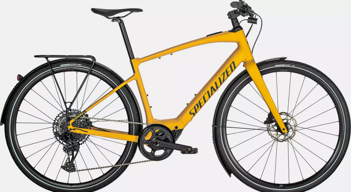 Turbo SL mounted rear rack, Racktime-compatible for your favorite bags and panniers, and DRYTECH fenders to keep the spray away.