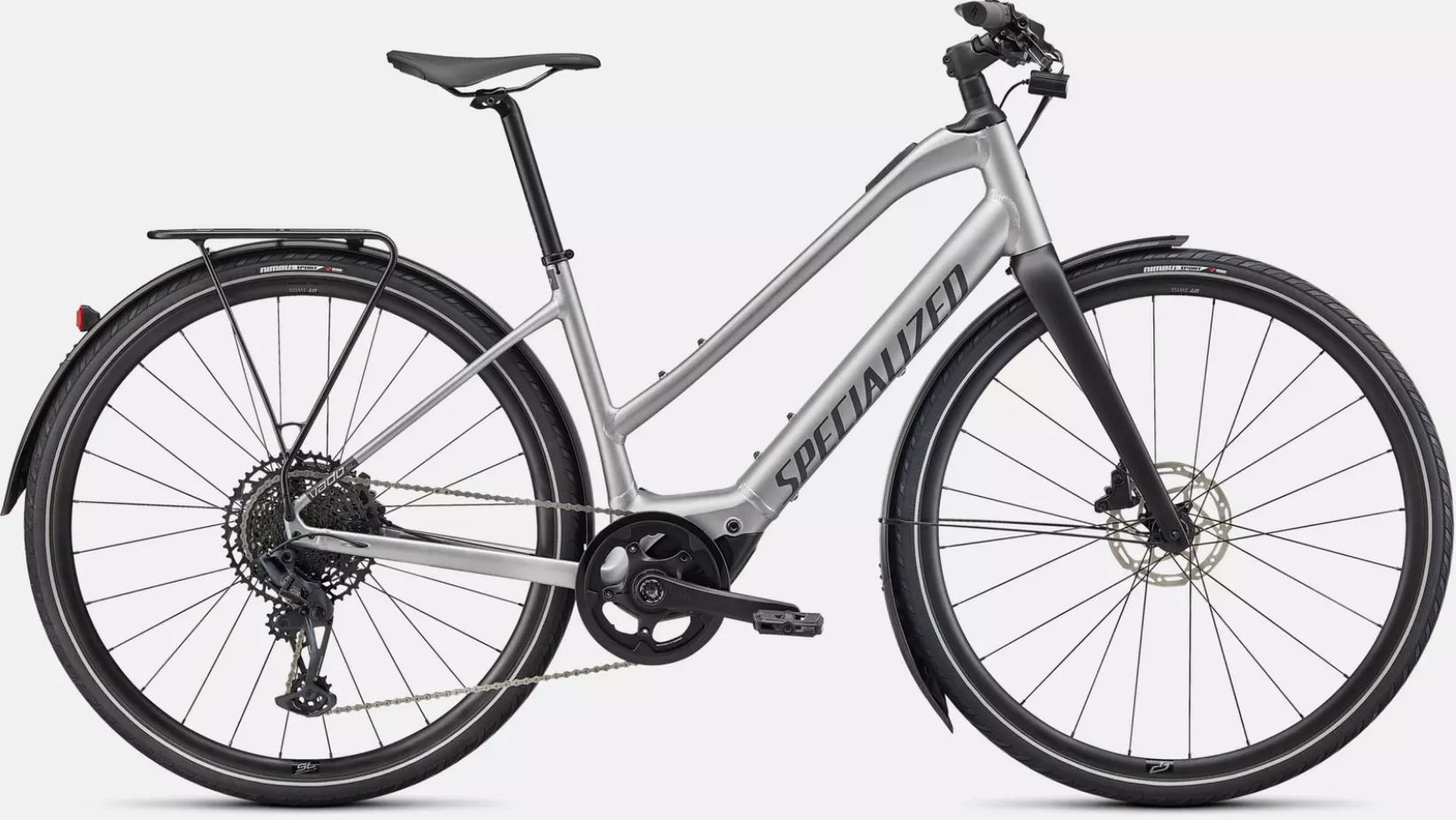 Step-through frame for easier on/off and managing commuter traffic. Turbo SL mounted rear rack, Racktime-compatible, for your favorite bags and panniers, and DRYTECH fenders to keep the spray away.
