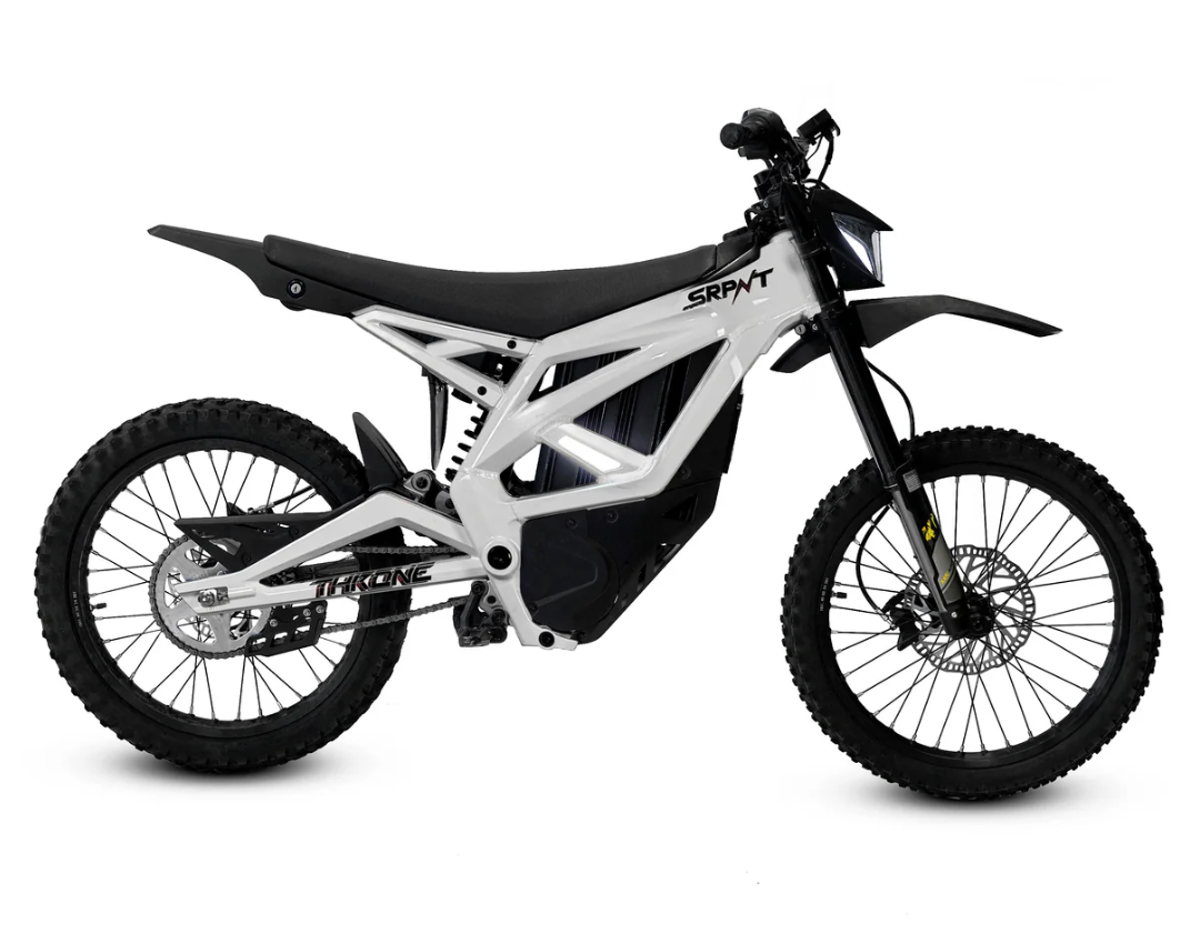 SRPNT is thrilled to unveil the culmination of two years of dedicated research, design, and hard work!!: introducing the all-new SRPNT e-DIRT BIKE powered by Throne Cycles! Experience the electrifying power of 72 volts and 10,000 watts of pure power! A custom alloy frame crafted under 3000 lbs. of pressure, this bike promises an unparalleled adventure.